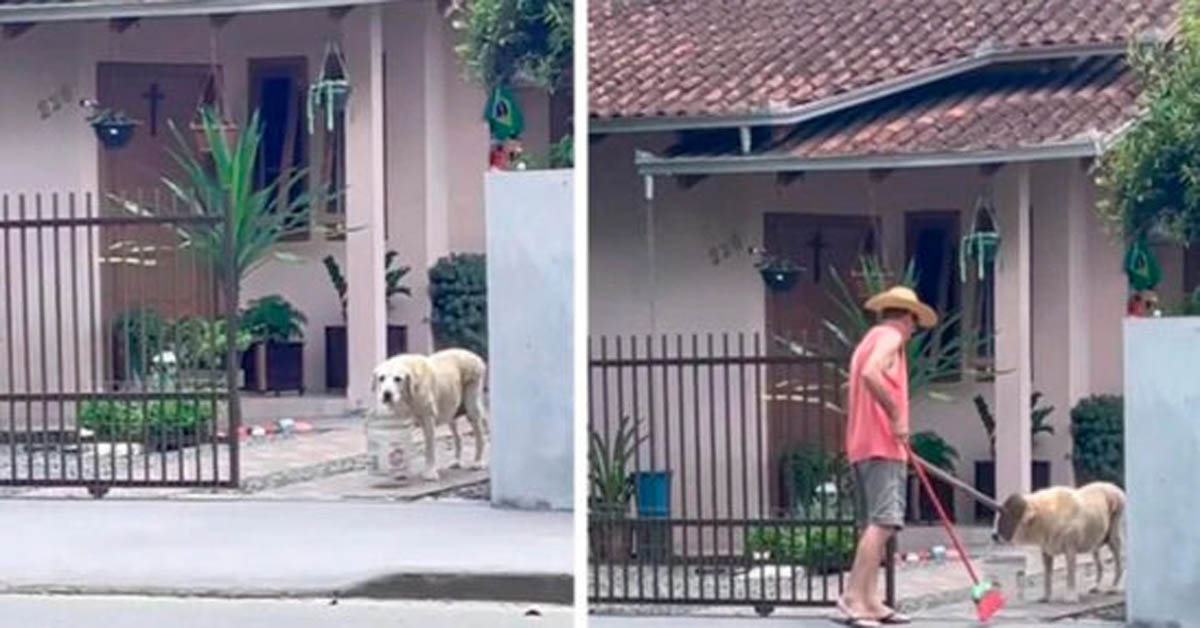 Perro ayuda a su cuidador a limpiar la casa y le sujeta el bote de la basura